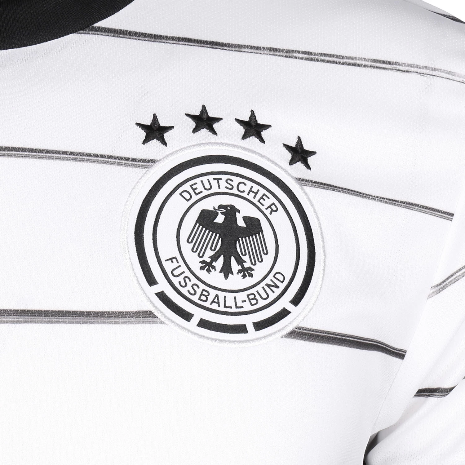 Das neue DFB Trikot für Kinder für die EM 2020 ist da. Das neue Heimtrikot überzeugt wie auch sein Vorgänger in traditionellem Weiß und natürlich mit bestem Tragekomfort. Mesh-Einsätze an den Seiten erhöhen die Atmungsaktivität. Als Eyecatcher wirken die wie von Hand gemalten Streifen sowie die abgesetzten Ärmelbündchen mit den deutschen Nationalfarben.Viele Features wie das hochwertige DFB-Logo auf der Brust und die dazugehörigen vier Sterne zeigen Jedem deine Verbundenheit mit der DFB-Elf. Abgerundet wird das ganze von einer Sternengrafik im Nackenbereich. Sichere Dir das neue Heimtrikot mit dem die Deutsche Mannschaft 2020 um den Pokal kämpfen wird.